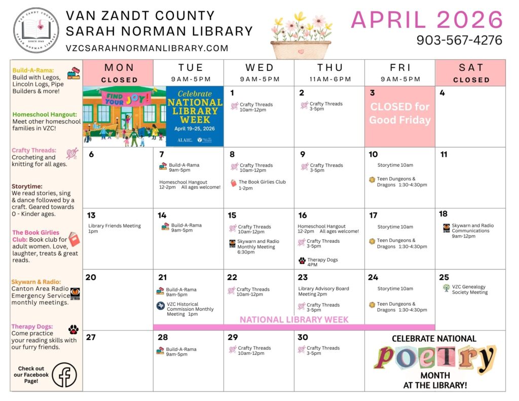 The Van Zandt County Sarah Norman Library will be CLOSED on Friday, April 3rd for Good Friday. We will open again on Tuesday, April 7th at 9am.